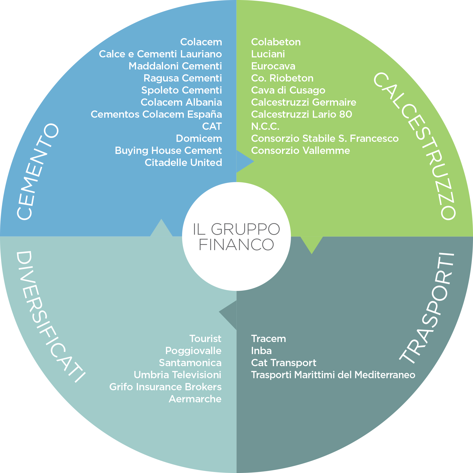 La controllata Colacem è il terzo produttore italiano nel settore del cemento così come Colabeton nel calcestruzzo. Oltre alle società di trasporti Tracem e Inba, sviluppatesi in funzione alle società del core, Financo è impegnata in settori diversificati come quello delle energie rinnovabili con Greenfin Energy, turistico–alberghiero, assicurativo, radio televisivo, fino al settore sportivo con il Misano World Circuit “Marco Simoncelli” di Misano Adriatico.